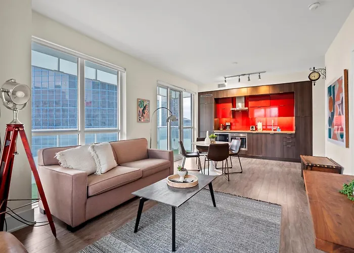 تقع الشقة المكونة من 2 غرفة نوم في منطقة وسط تورونتو في تورونتو، على بعد 450 متر من أكواريوم ريبلي في كندا وفي غضون 5 دقيقة تقريبًا سيرًا على الأقدام من برج سي إن. تقع هذه الشقة على بعد 0.9 كم فقط من محطة مترو سانت أندرو ومسافة قصيرة من موقع فورت يورك التاريخي الوطني. ستجد حديقة جزر تورونتو على بعد 25 دقيقة تقريبًا مشياً على الأقدام من مكان الإقامة.